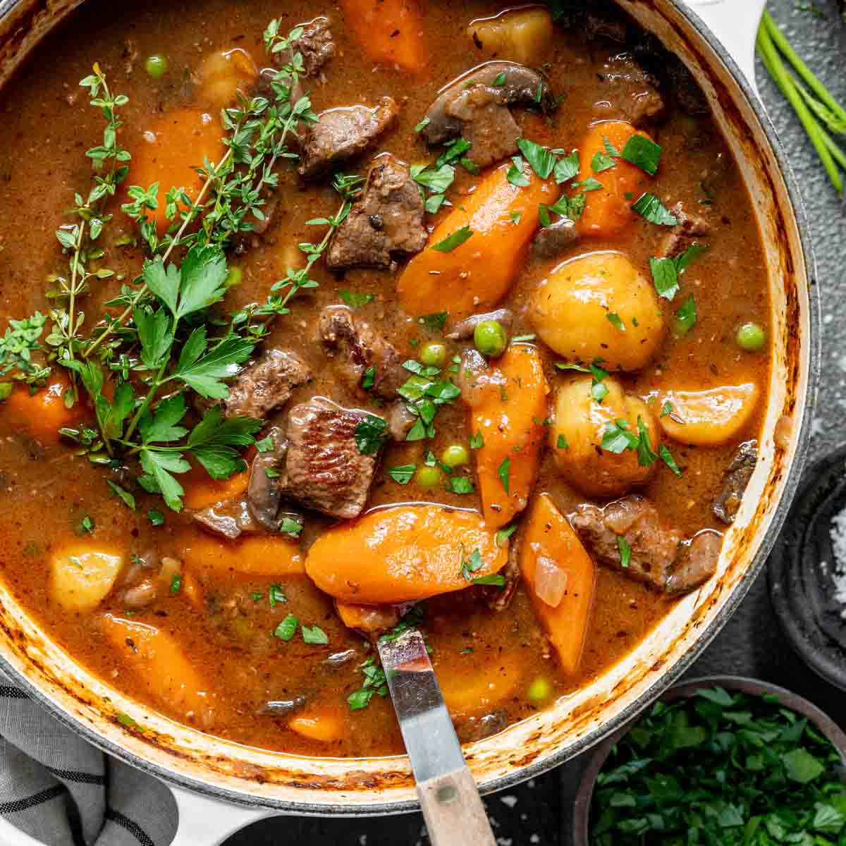 Remove the stew from the oven and serve in shallow bowls with crusty bread.